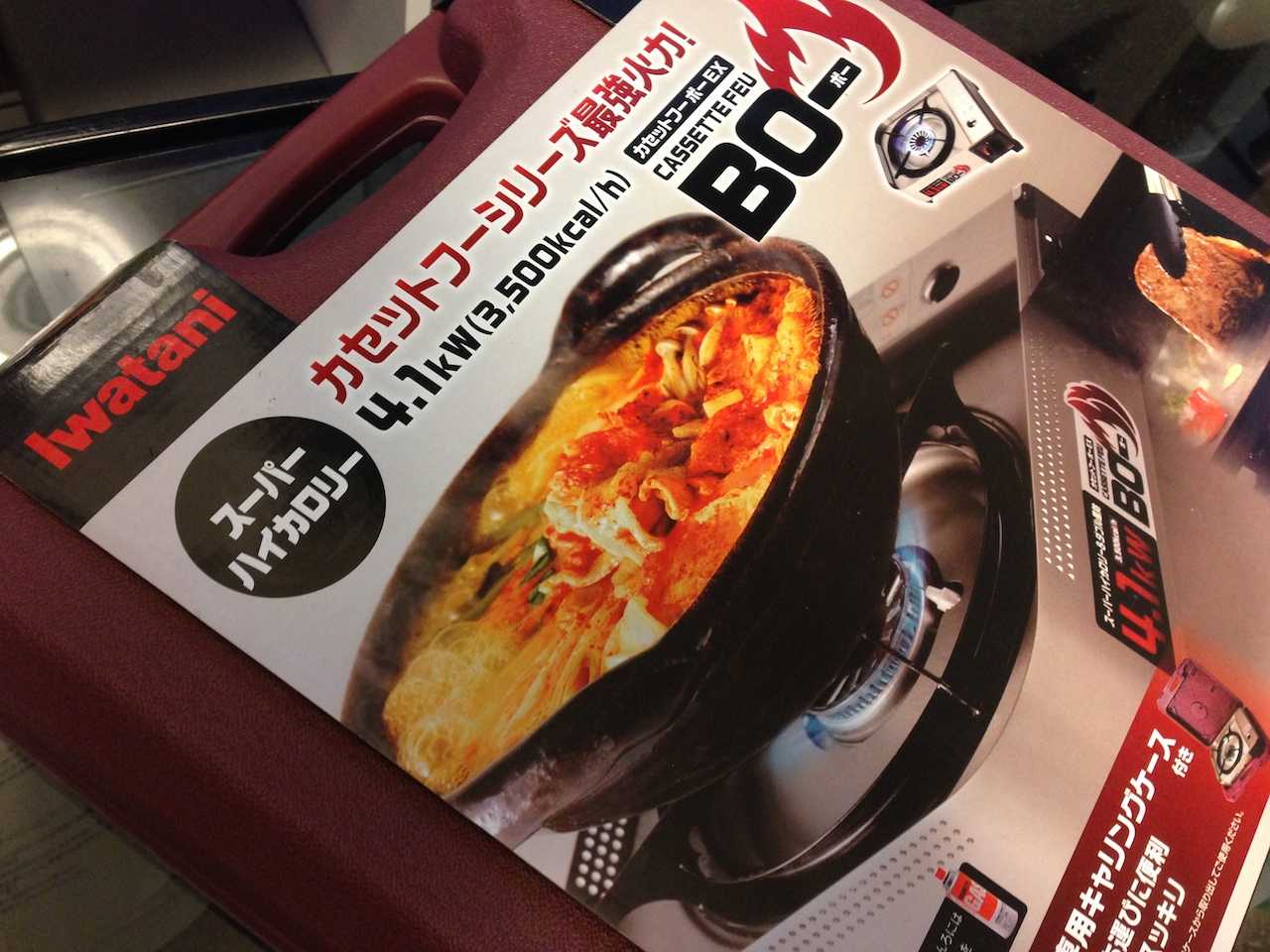 まず、カセットコンロの紹介です。 用意していただいたのは、 4.1kw の火力を誇る Iwatani 謹製の「カセットフーボー EX」でした。 なんと、標準で持ち運びに便利な臙脂(えんじ)色のケースがついており、 野外で使う際も便利な設計になっています。