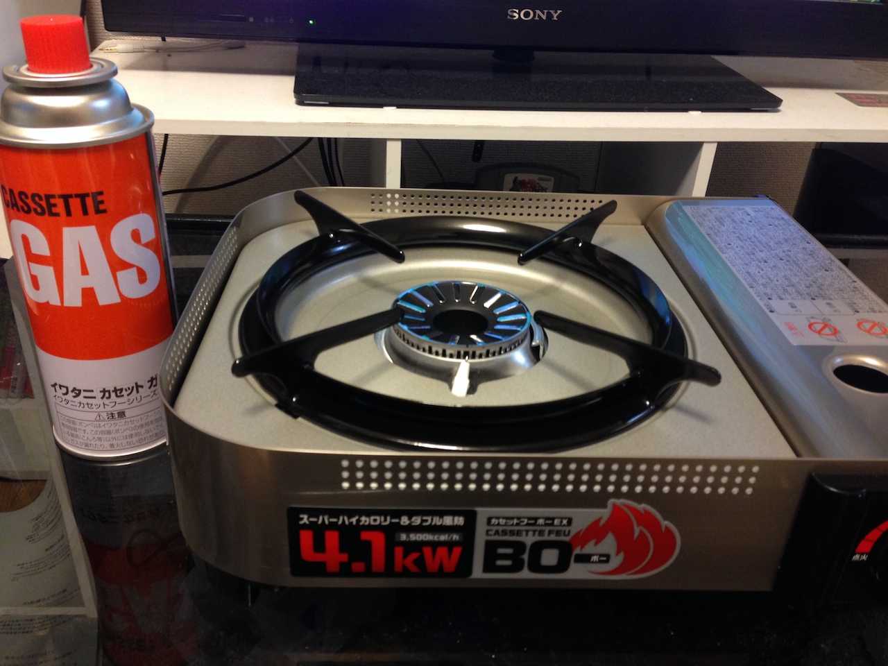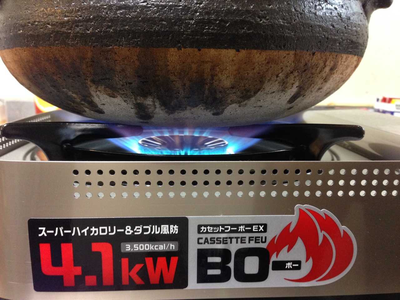 着火。まず第一印象、火力が高い。流石は Iwatani。伊達じゃない。 しかし、当然家庭用のコンロには勝てるわけもなく、 いつもと比べて、沸騰までに数分程度時間を余分に要しました。